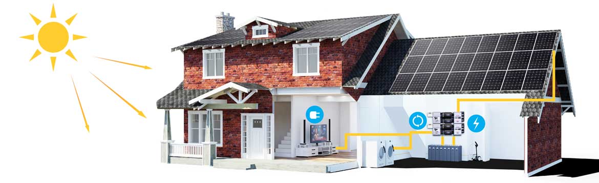 الضوئية (PV) الألواح الشمسية لتحويل ضوء الشمس إلى تيار مباشر (DC) الكهرباء، وهو ما يتم تغذيتها من خلال العاكس للطاقة الشمسية لخلق صالحة للاستعمال التيار المتردد (AC) الكهرباء. ثم يتم إرسال الكهرباء AC لوحة مفاتيح، حيث يتم إرسالها إلى الأجهزة المنزلية التي تستخدم الكهرباء في ذلك الوقت، ويتم إرسال أي الكهرباء الفائضة للبنك البطارية لإعادة شحنه.