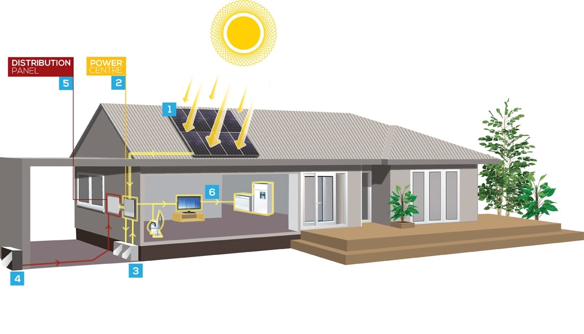 Photovoltaic (PV) solar panels convert sunlight to direct current (DC) electricity, which is then fed through the solar inverter to create usable alternating current (AC) electricity. AC electricity is then sent to the switchboard, where it is sent to the household appliances that are using electricity at the time, and any surplus electricity is sent to the battery bank to recharge it.