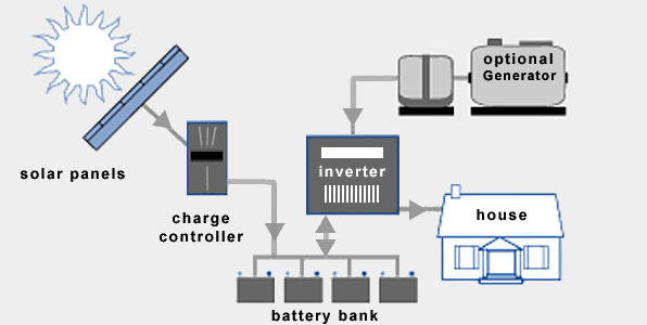 If the battery bank state-of-charge level gets too low, the inverter/charger will turn on the fuel generator automatically to power the house electrical appliances and recharge the battery bank.
